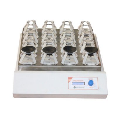 Designed for continues shaking of solution. It is compact bench type table top model with platform fitted with Rubber Discs mounted on Kame Bearing assembly to give an orbital motion to the flasks, within a diameter of kame assembly to provide low noise and stable operation heavy and sturdy Base with Balance fapproximately 2″. The motor Directly coupled with Motor to Provide Hassel free Operation Speed is Controlled by mechanical speed Controller. To work on 220/230 Volt 50Hz AC Supply.